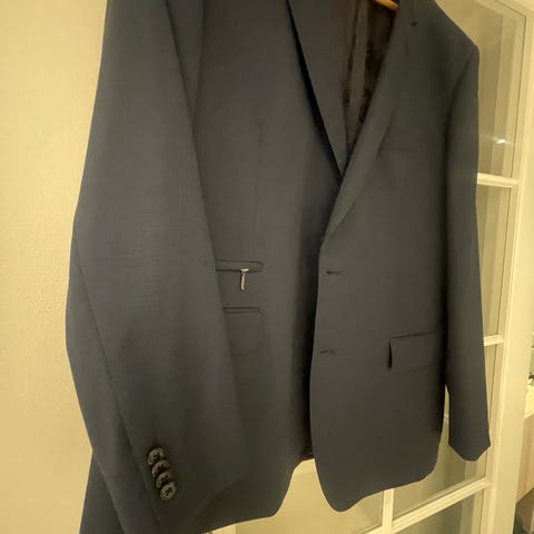 Mørk blå dress m/ skjorte i lys blå mønster selges. Se bilder for eksakte størrelser.