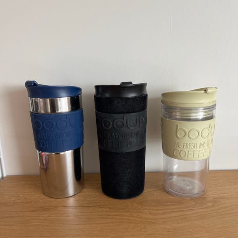 Bodum termokrus laget av plast med silikonhylster for bedre grep. Krusene har lokk for å forhindre søl og er egnet for varme drikker som kaffe og te.