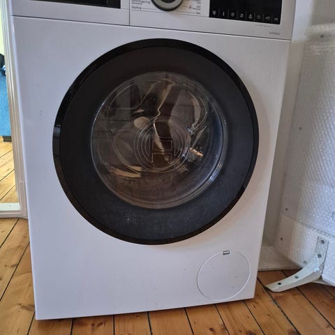 Vaskemaskinen er i fin stand. Den har et pittelite hakk på døren (som sett på bildene).