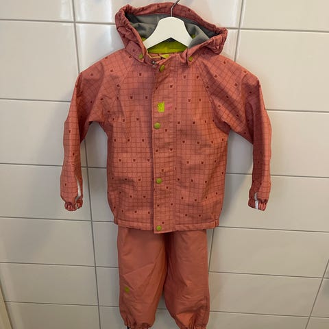 Kattnakken regntøy str 110, godt brukt. Noe misfarging på jakken og knærne (farge slitt av) + en rift og ingen strikker under.