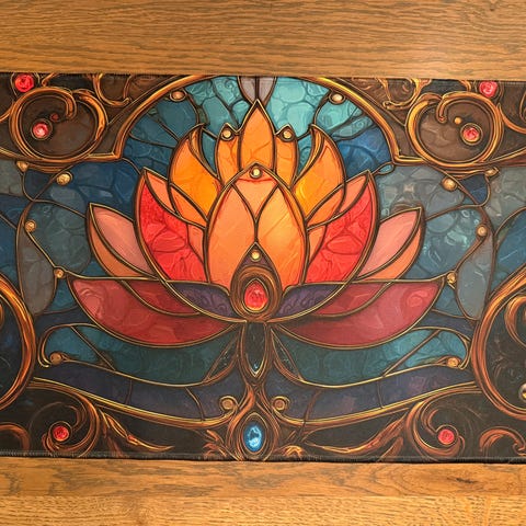 Magic The Gathering Grand Prix Copenhagen spillmatte med motiv i rød og oransje fargetoner. Spillmatten er designet for bruk under kortspill og har et illustrert motiv med fantasy-tema.