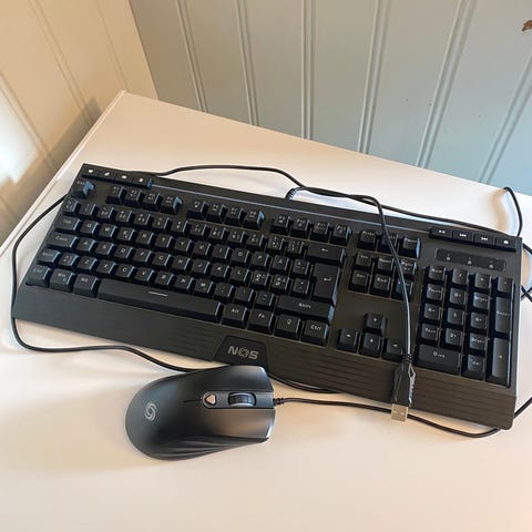 NOS gaming tastatur, mus og headset med RGB-belysning. Tastaturet har full størrelse med numerisk del og RGB-lys. Musen har flere knapper og RGB-lys. Headsetet har justerbar hodebøyle og over-ear øreklokker med integrert mikrofon.