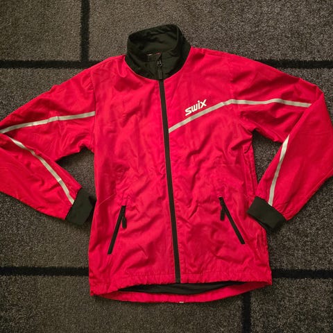 Swix treningsjakke for junior i størrelse 152. Jakken har fargene rød, marineblå og hvit, og har 2 lommer med glidelås. Myk fleece i kraven