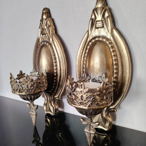 To vakre og solide vegglysestaker i messing selges samlet. Klassisk og dekorativ form med svungne detaljer, som gir et elegant og varmt uttrykk på veggen.
