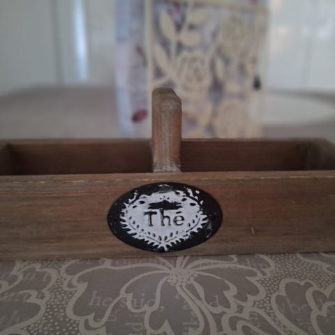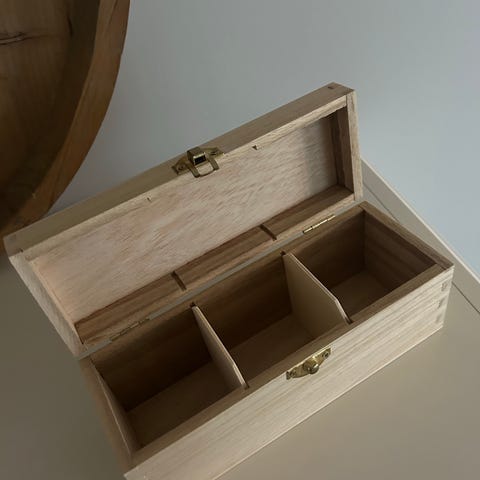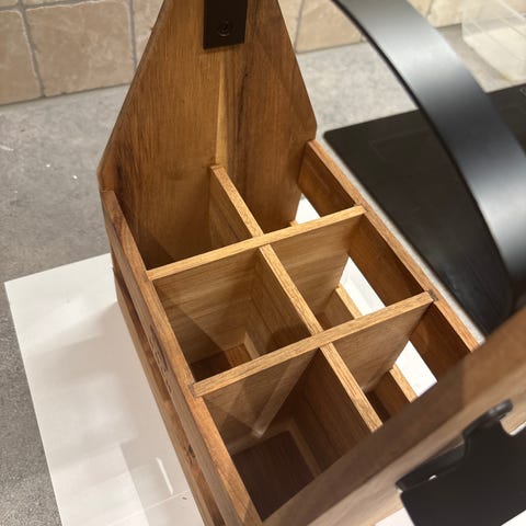 Kjøkkenutstyr i tre med flere rom for oppbevaring. Produktet har en rektangulær form med skillevegger og metallhåndtak.