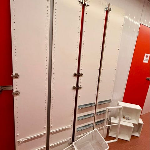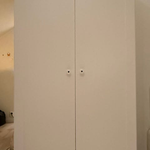 Selger pent brukt platsa skap m garderobestang og 3 skuffer. Skapet er to delt og har en stamme på 180 og en stamme på 60 (totalt høyde 240) pene knotter i "gull".