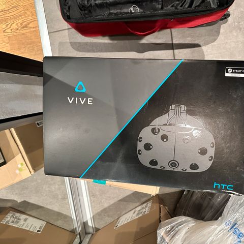 HTC Vive VR-headset med tilhørende kontroller og basestasjon.