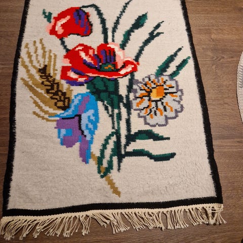 Flott vevd teppe med frynser i begge ender.156 langt, 0,95 br