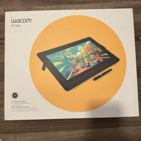 Wacom One 1. Generasjon tegnebrett med berøringsskjerm og medfølgende penn. Enhet designet for digital tegning og illustrasjon, med integrert stativ for bruksvinkel.