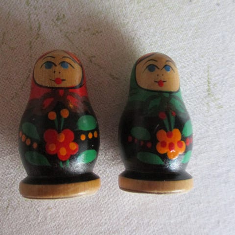 Russiske Babushka dukker i tre, håndmalt med tradisjonelle farger og mønstre. Settet består av 10 dukker i ulike størrelser som kan settes inn i hverandre. Laget i Russland, dekorative og samleobjekter.