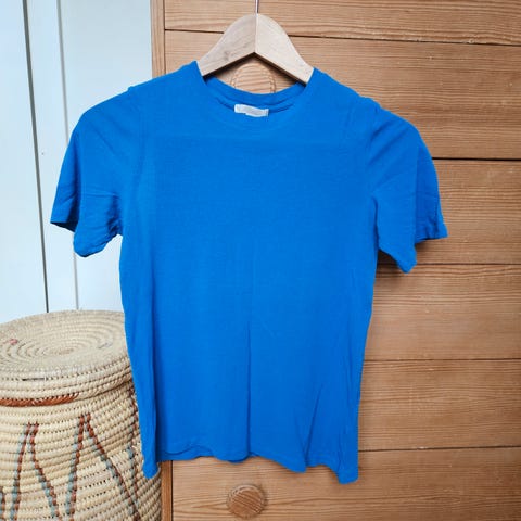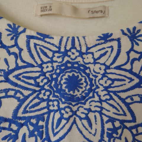 Meget pen blå topp til dame av merket SFERA. Veldig lett og deilig stoff. Trolig viskose, men ikke helt sikker.