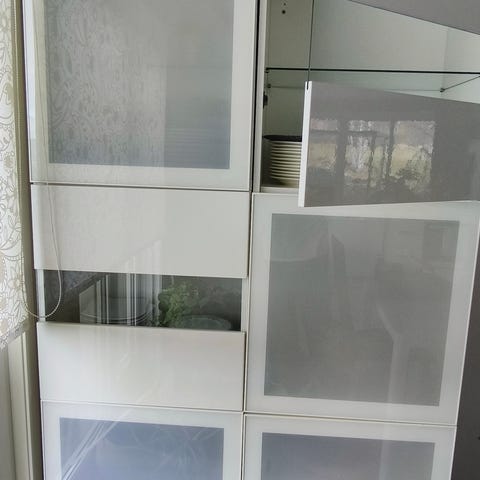 Lys i toppen av skapet som lyser gjennom glasshyller. Merk at det ene blinker litt så det kan hende det bør byttes, men det er en rimelig sak på IKEA.