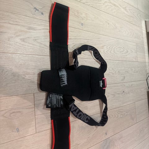 Vesten er svart med røde detaljer og har beskyttende polstring på ryggen.