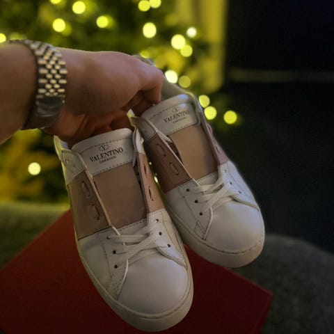 Valentino rockstud joggesko i hvit, størrelse 38. Skoene har detaljer med nagler og en robust såle, egnet for hverdagsbruk. de er kjøpt på tise for 3500, og da uten kvitteringer osv. så er veldig usikker på om disse er ekte (mest sannsynlig ikke), men ligner😬 men selger fordi de ikke blir brukt så mye som jeg trodde de ville bli! bare å spørre om flere bilder🥰