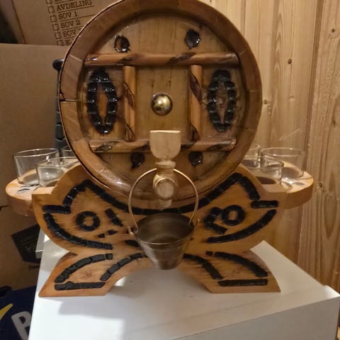 Beholderen har plass til ca 3,7L væske, som man ser på bildet mangler den det ene glasset.
