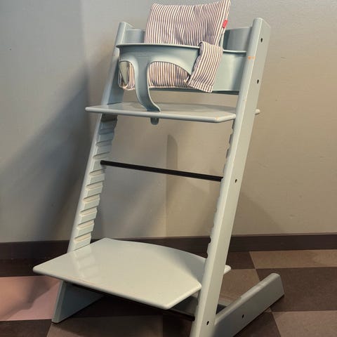 Babysett til Stokke Tripp Trapp: rygg, bøyle, sele og festedeler. Pent brukt, hel og fin. Obs! Uten brett.