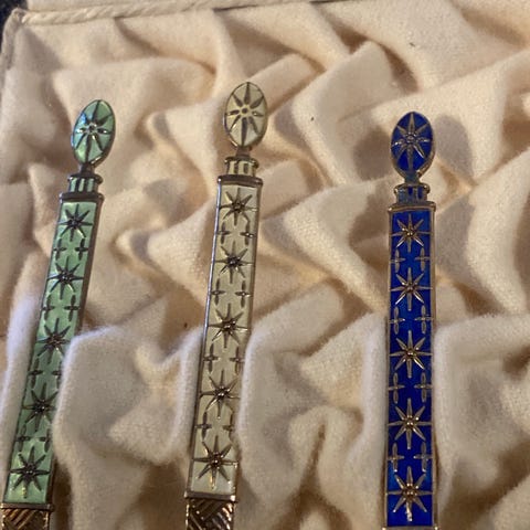 12 vakre teskjeer ca 9 cm, fra Tostrup. De lages ikke lenger, og ligger i originaleske.Skjeene har håndlagde detaljer.😊
