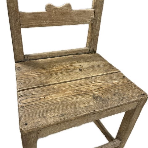 Antikk spisestol laget i massivt heltre med utskåret dekor på ryggstøtte og ben.