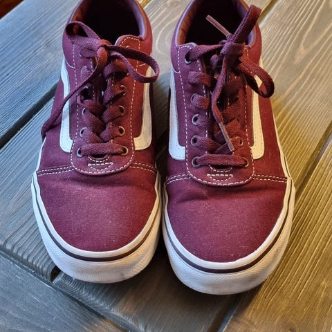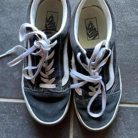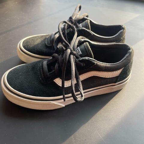 Vans unisex sko i størrelse 34 med svart overdel og røde lisser. Skoene har en hvit såle med rødt bånd langs kanten. Materialet ser ut til å være semsket eller lignende stoff. Passer for barn.Datteren min fikk dem i gave av tanten sin. Hun brukte dem et par ganger, men de er definitivt ikke i fargen hennes. Hun liker dem ikke fordi de ikke er rosa. De viser noen tegn på slitasje, men det er helt vanlige sko i god stand.