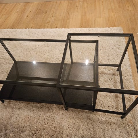 Selger et stilrent sett med to kvadratiske sofabord som kan skyves under hverandre. Kjøpt på bohus med