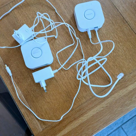 Philips Hue Bridge. Enhet for tilkobling av Hue-lys til nettverk, med strømadapter inkludert. Har porter for Ethernet og strøminngang