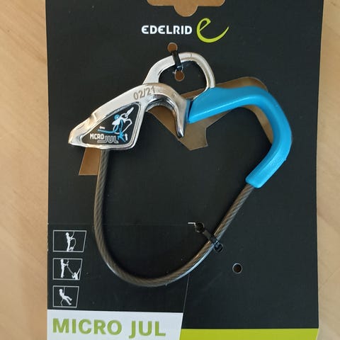 Pakke med moderne taubrems og skrukarabiner med retningsfiksering. Gir god sikring under klatring på tau selv for nybegynnere.
