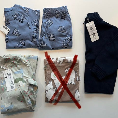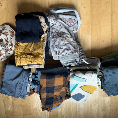 Varierende grad av slitasje. Noe er mye brukt, annet lite brukt. Plaggene er hele, og så vidt jeg kan se uten flekker.