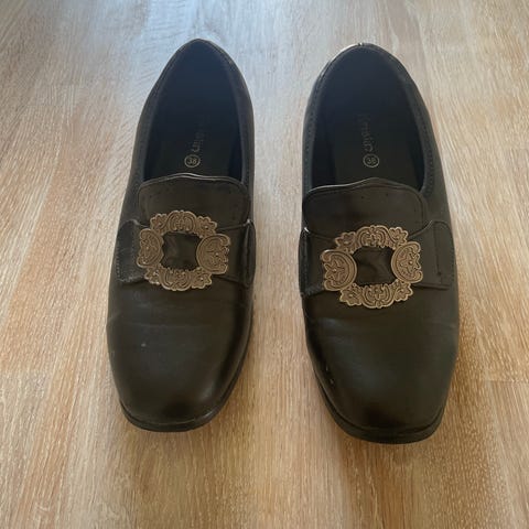 Kristin bunadsko i størrelse 38, svart farge. Skoene har en dekorativ spenne på forsiden og en lav hæl, som også barn kan gå på. Pene.