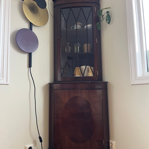 Selger et pent brukt Gustaviansk hjørneskap. (Innholdet i vitrineskapet følger ikke med).