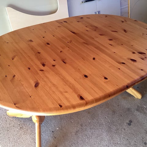 Stort spisebord i furu heltre selges. Bordet selges med to klaffer og seks stoler. Bordet har en solid mekanisme for enkel uttrekk når klaffer skal legges i. Med begge klaffer i er det plass til 12 personer rundt bordet. Stolene ble trukket om i 2020, og er fint brukt.