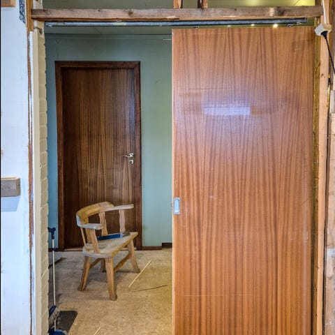 Hvit skyvedør med ramme, skinne og hengsler