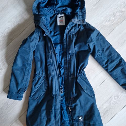 Kari Traa parkas i størrelse XS. Veldig praktisk jakke for høst og vår, lett fôret. Jakken har hette og snøring i midjen for justering.
