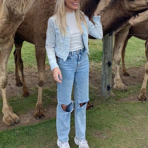 Selger en jeans i lys denim med slitte detaljer, størrelse XS. Buksen er godt brukt, men fortsatt pen og i god stand.