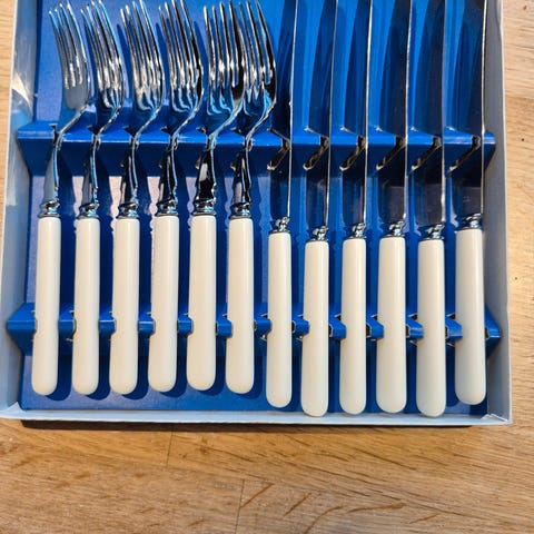 10 hvitskaftede kniver og 12 gafler fra Billam of Sheffield England.