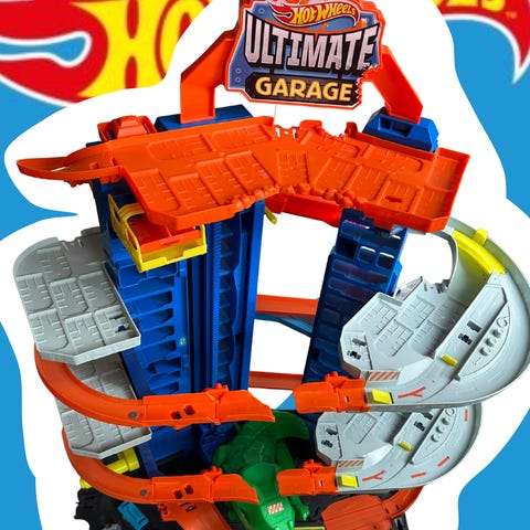 Hot Wheels Ultimate Garage med flere etasjer og ramper for bilkjøring. Inkluderer heisfunksjon for å løfte biler til toppen, ulike kjørebaner, på toppen kan man skyte bilene ut slik at de treffer en drage som «faller» til bakken når den blir truffet.
