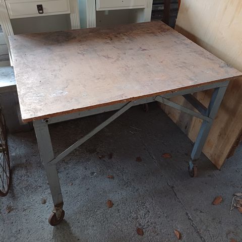 Brukt som arbeidsbord. Å lakk bord. Så bærer preg av littt lakk oppi ellers fungerer alt ok :)