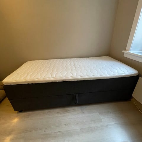 Selve rammen er kjøpt hos Bohus og er mørk grå. Madrassen er kjøpt hos JYSK og er en skum-/memory-foam-madrass. Madrassen er uten flekker og i veldig god stand, ganske «ny». Jeg kan sende bilde av madrassen ved behov.