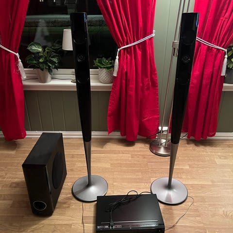 LG lyd- Blueray /hjemmekinoanlegg med hovedenhet, to høyttalere og en subwoofer. Kan koble på senterhøyttaler og bakgrunnshøyttalere. Mener den også har Netflix.