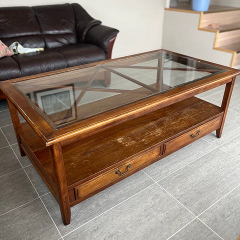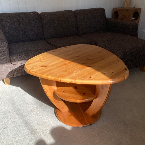 Stort, stilig og stødig salongbord/stuebord med glassplate i midten og romslig hylle under selges. Mål 140 cm X 80cm. Høyde 47 cm