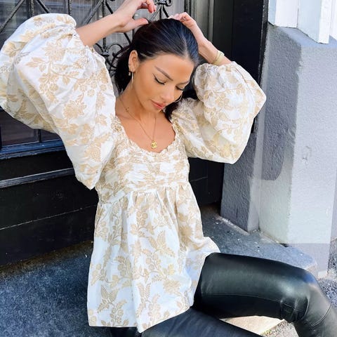 Både nydelig og kul brocade-topp med gull-print selges. Den har firkantet utringning foran og bak, puffermer med elastikk over skulder, og babydoll-snitt med masse volum. Minimalt brukt så den er i veldig god stand. Kan hentes på Gjøvik eller sendes.