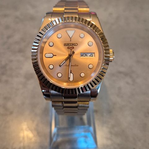 Selger en meget pen Seiko mod-klokke med klassisk Datejust-inspirert design. Klokken har en flott rød sunburst-skive som skifter uttrykk i lyset, kombinert med romertall og dato med lupe.