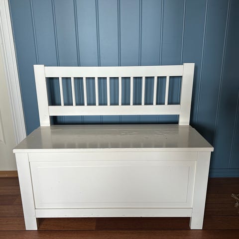 Fin benk med oppbevaring, fint til for eksempel barnerommet til oppbevaring av leker