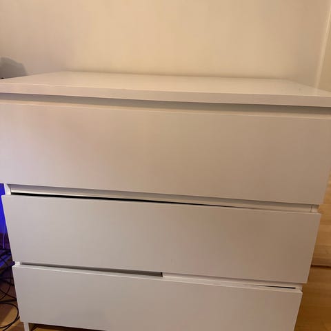 Pen kommode fra IKEA. I nederste skuff har skruene løsnet og kommoden gis derfor bort (antakelig enkelt å fikse). De to øverste skuffene fungerer som de skal.