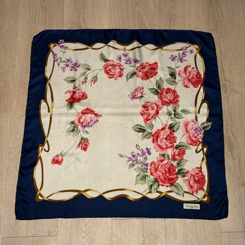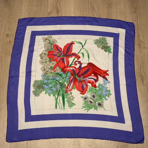 85*87cm har noen bruksmerker, i marineblå farge og lilla blomst.