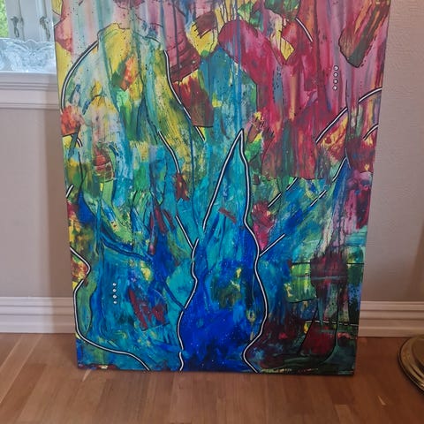 Abstrakt maleri med en kombinasjon av blå, grønne og jordfargede nyanser. Maleriet viser organiske former og planeter i et kunstnerisk design. Passer til dekorasjon av veggflater.