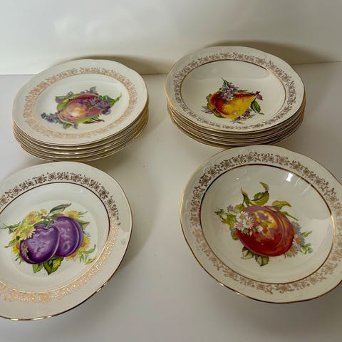 Figgjo, Stavanger flint, Porsgrunn servise bestående av tallerkener med ulike dekorative mønstre i flere farger som varierer i design, inkludert blomster, frukt og figurer, mange i Turi design. Gi bud ved interesse!