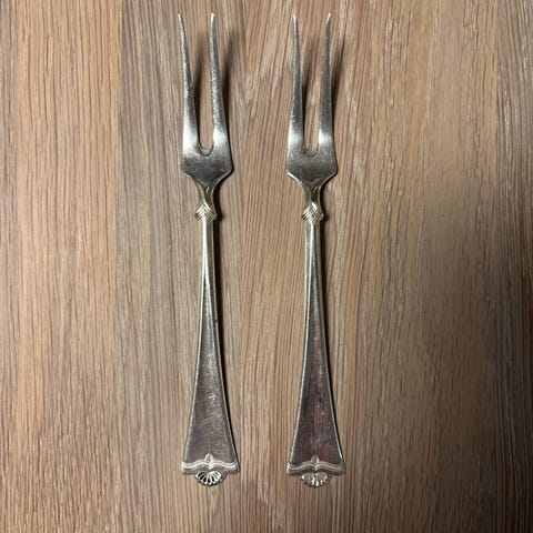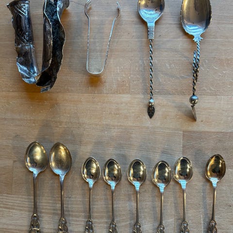 6 gullfargede teskjeer ca 10,5 cm. Selges uten eske. 300,- for 6 stk. Hentes eller sendes.