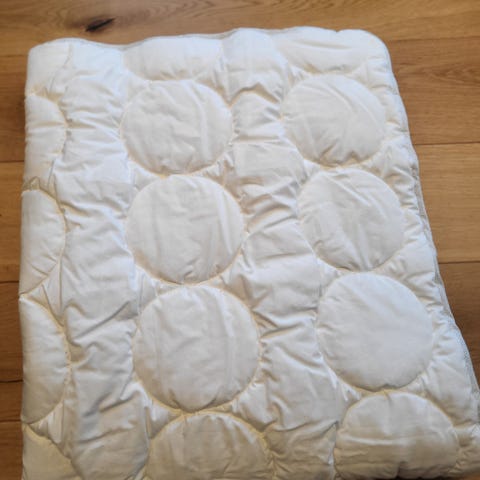IKEA STJÄRNA barnesengdyne med trekk. Dynen har et trekk med stjerner i blått og hvitt, og et illustrert motiv med kanin og lam på den ene siden. Dynen er laget for barn og har en størrelse som passer til barneseng.