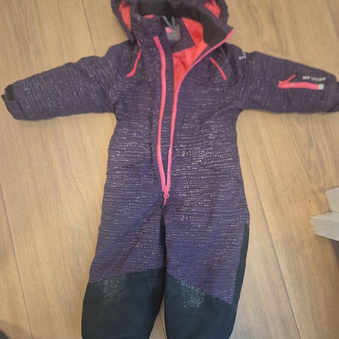 Vinterdress str. 86. Strikker under foten bør byttes ut og noen slitemerker på knærne og rompa på dressen. Blitt noe mørkere ytterkant på armene. Mye bruk igjen.