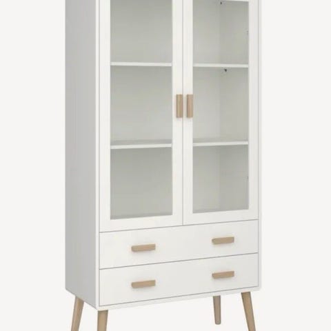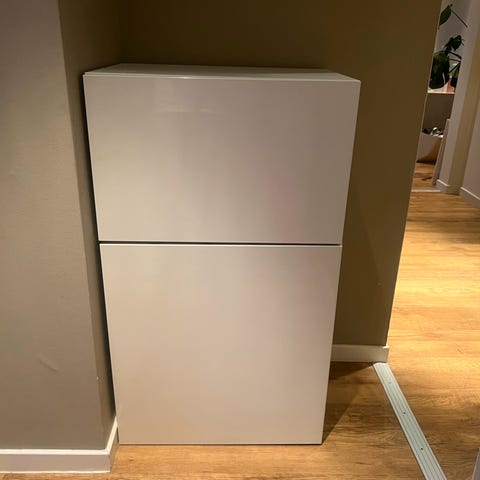2-modull IKEA Bestå oppbevaring system hvit med 2 skuffer (liten del) og 2 dører med 3 hyller totalt (stor del).